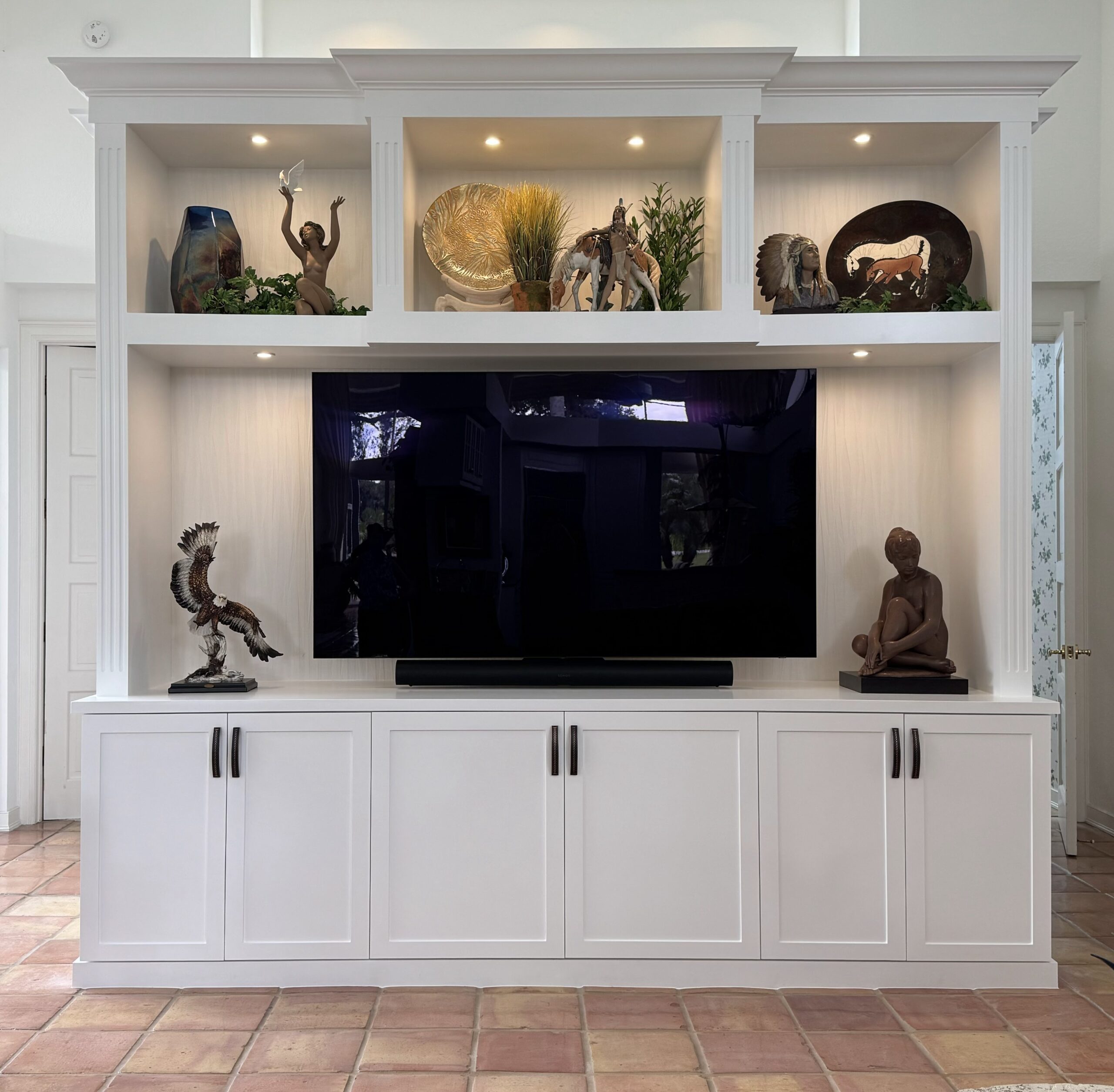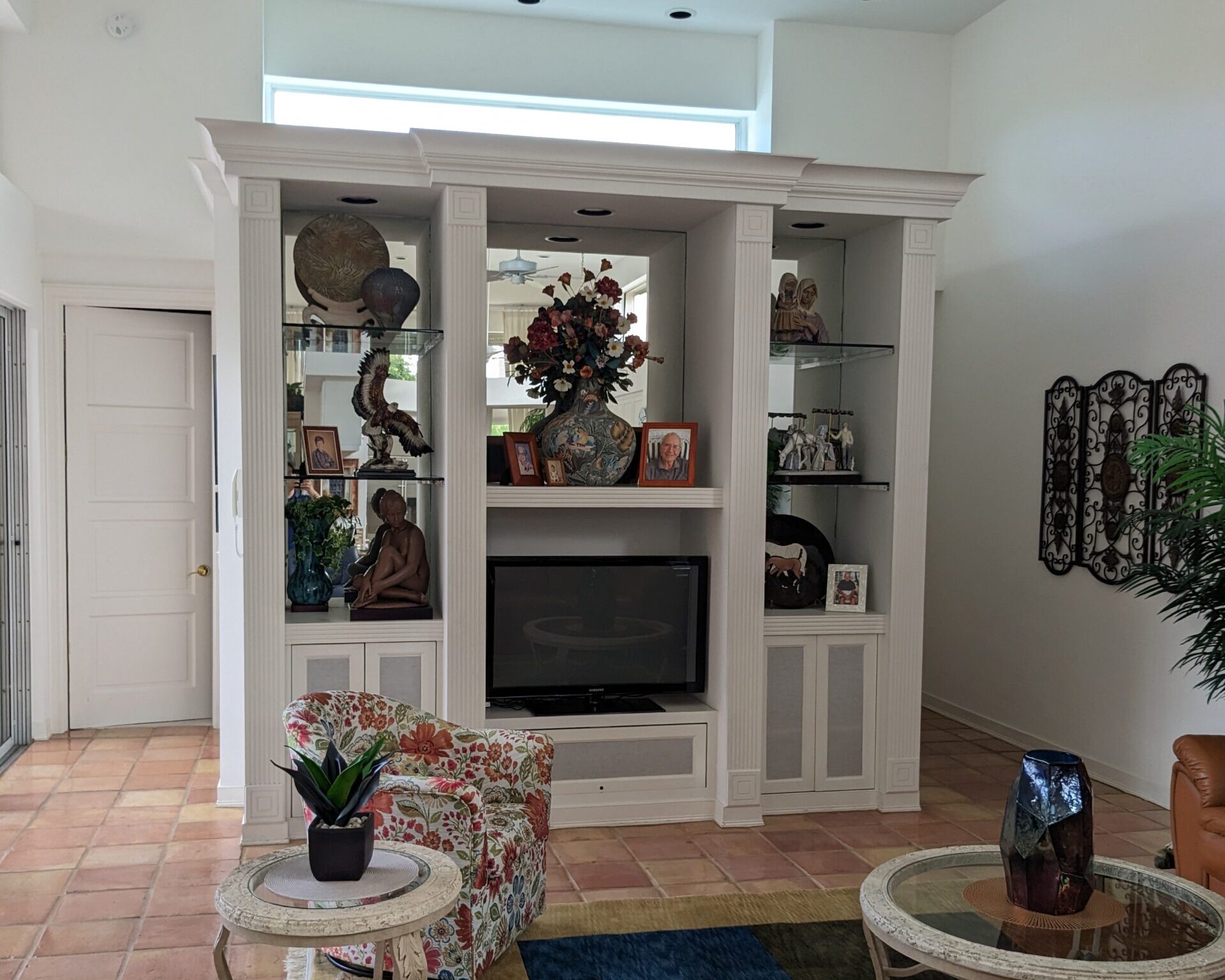 See the before and after of this custom entertainment center, transformed into a clean, functional, and beautifully tailored piece for the space.